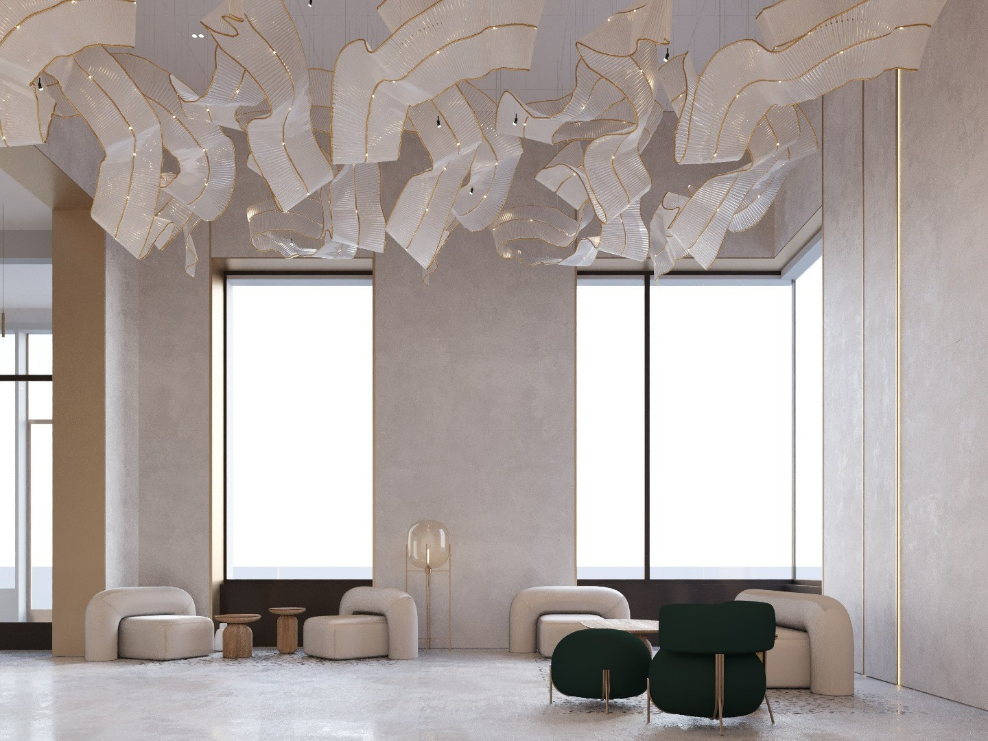В лобби корпусов квартала Rossini центральным акцентом стал арт-объект, выполненный из перфорированных металлических лепестков с подсветкой, который органично соединяет различные элементы интерьера.